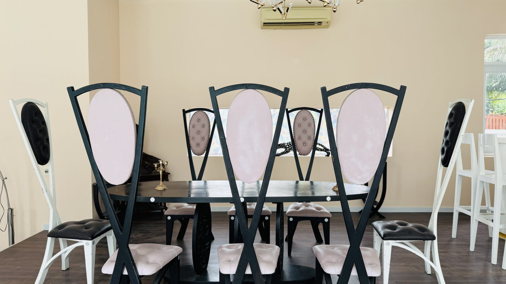 Features include: large great room with open wooden beams and structural steel supports. Massive architectural stone fireplace and floor to ceiling windows for great light and 180 degree views of granite ridgeline. No homes or other man-made structures visible other than a distant stone tower. Garage and side meadow provide additional space for staging.